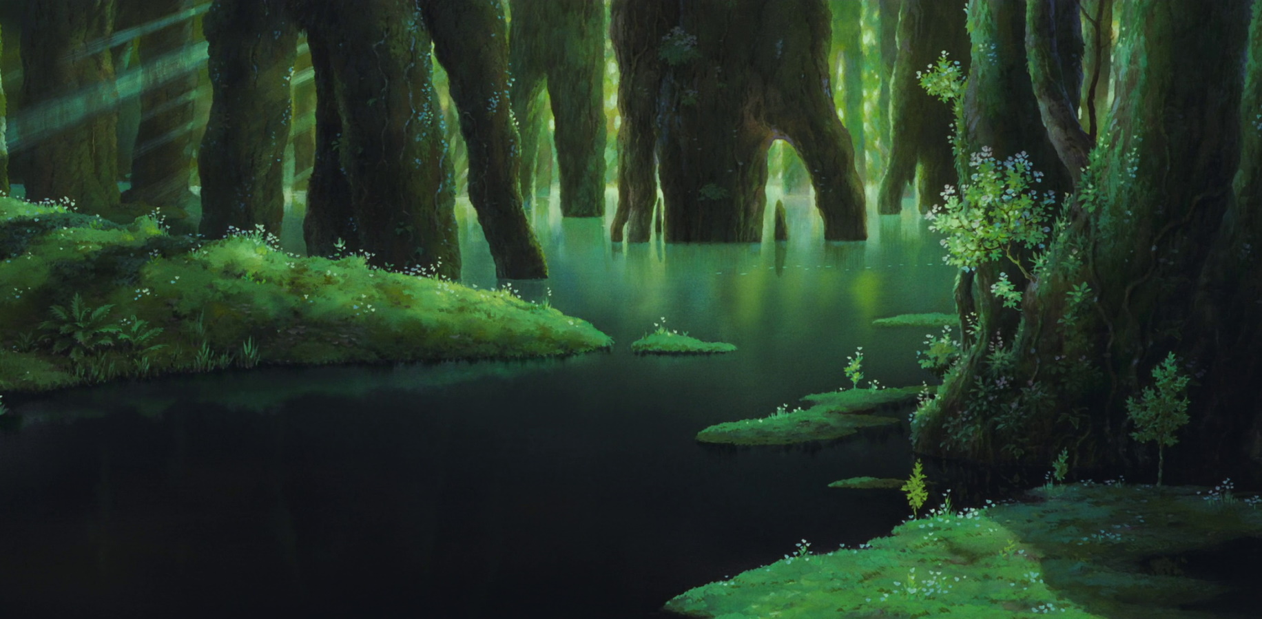 I was surprised not to be able to find a full-resolution image of the lovely panoramic background from the sacred forest scene in Princess Mononoke. I assembled this one from screengrabs. It had to be cropped a bit and there’s an imperfection on one of the trees that’s in the film, but it’s better than any other version I could find.